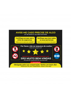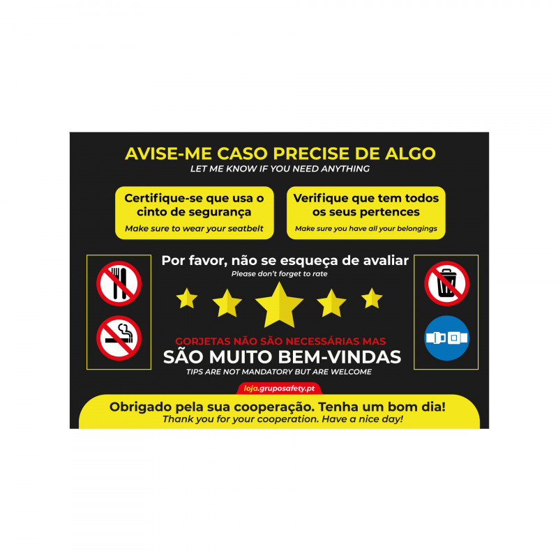 Desenhado para comunicar de forma clara, rápida e universal, este autocolante reúne mensagens essenciais de segurança, cortesia e comportamento, combinando texto em português e inglês com simbologia facilmente reconhecível.