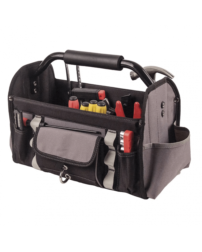 Saco de ferramentas Soft Shell aberto com os lados dobráveis e base de PVC removível. Proporciona um acesso fácil a todos os conteúdos. Incorpora uma barra reforçada com uma almofada aderente para facilitar a mobilidade. Apresenta quatro bolsas abertas, um bolso coberto, 1 anel em D, seis laços de fixação exteriores e 14 laços de fixação interna.