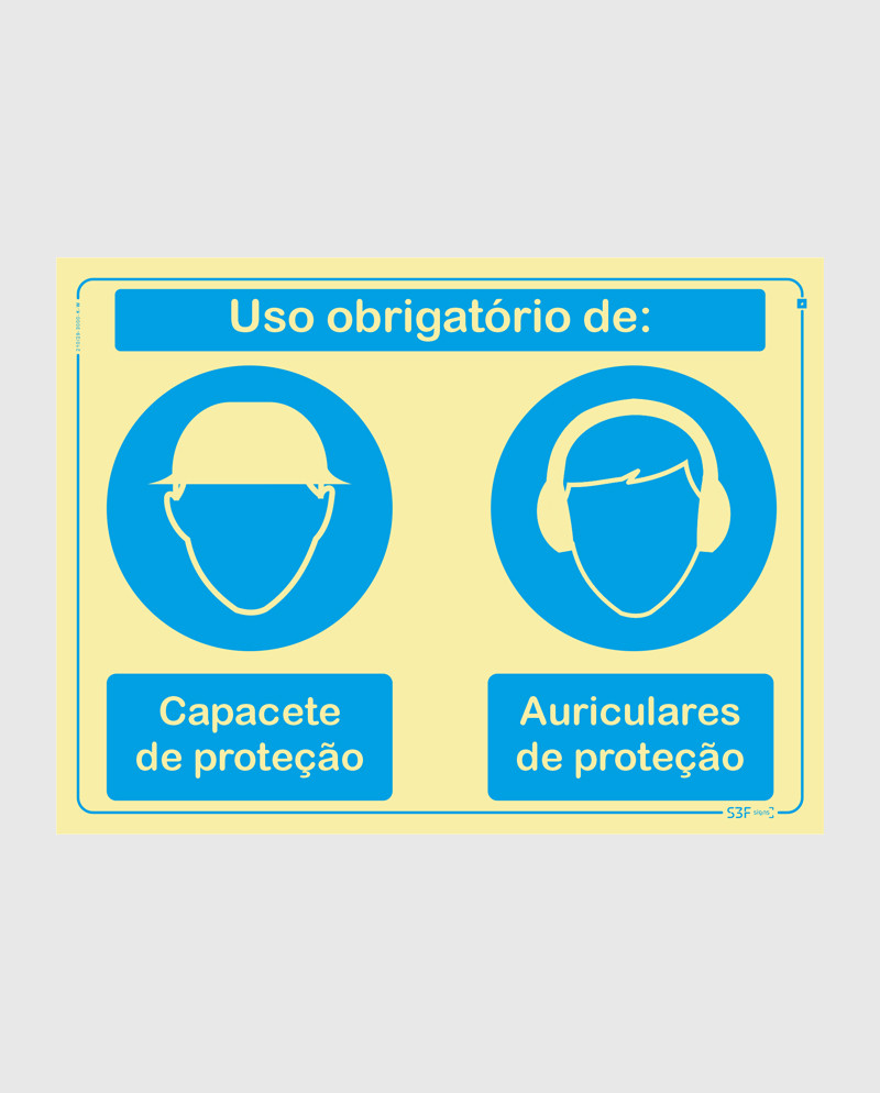 Este sinal de uso obrigatório de capacete e auriculares de proteção é indispensável para garantir a segurança em ambientes ruidosos e com risco de queda de objetos. Informa de forma clara que o uso destes equipamentos de proteção individual é obrigatório, contribuindo para prevenir lesões auditivas e impactos na cabeça durante a execução de tarefas em zonas industriais, obras ou fábricas.